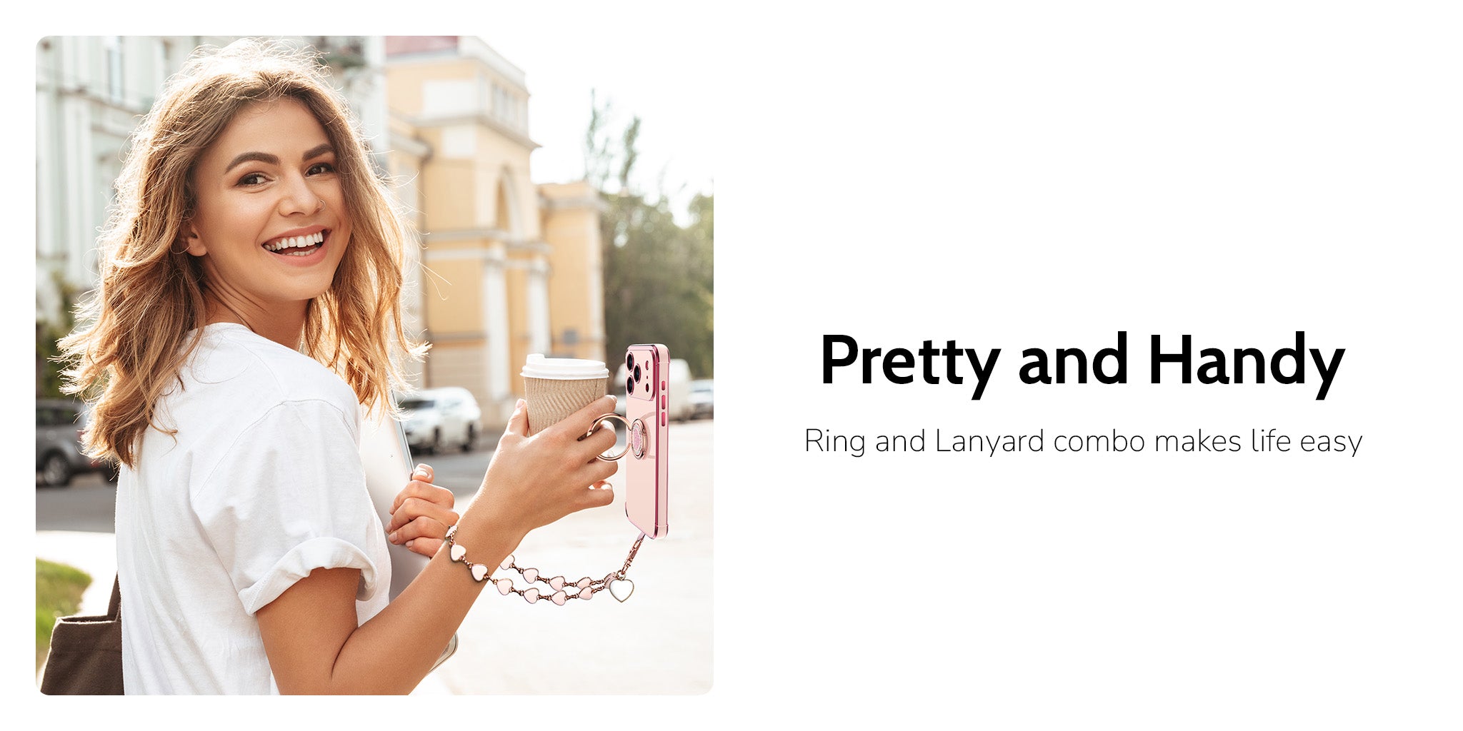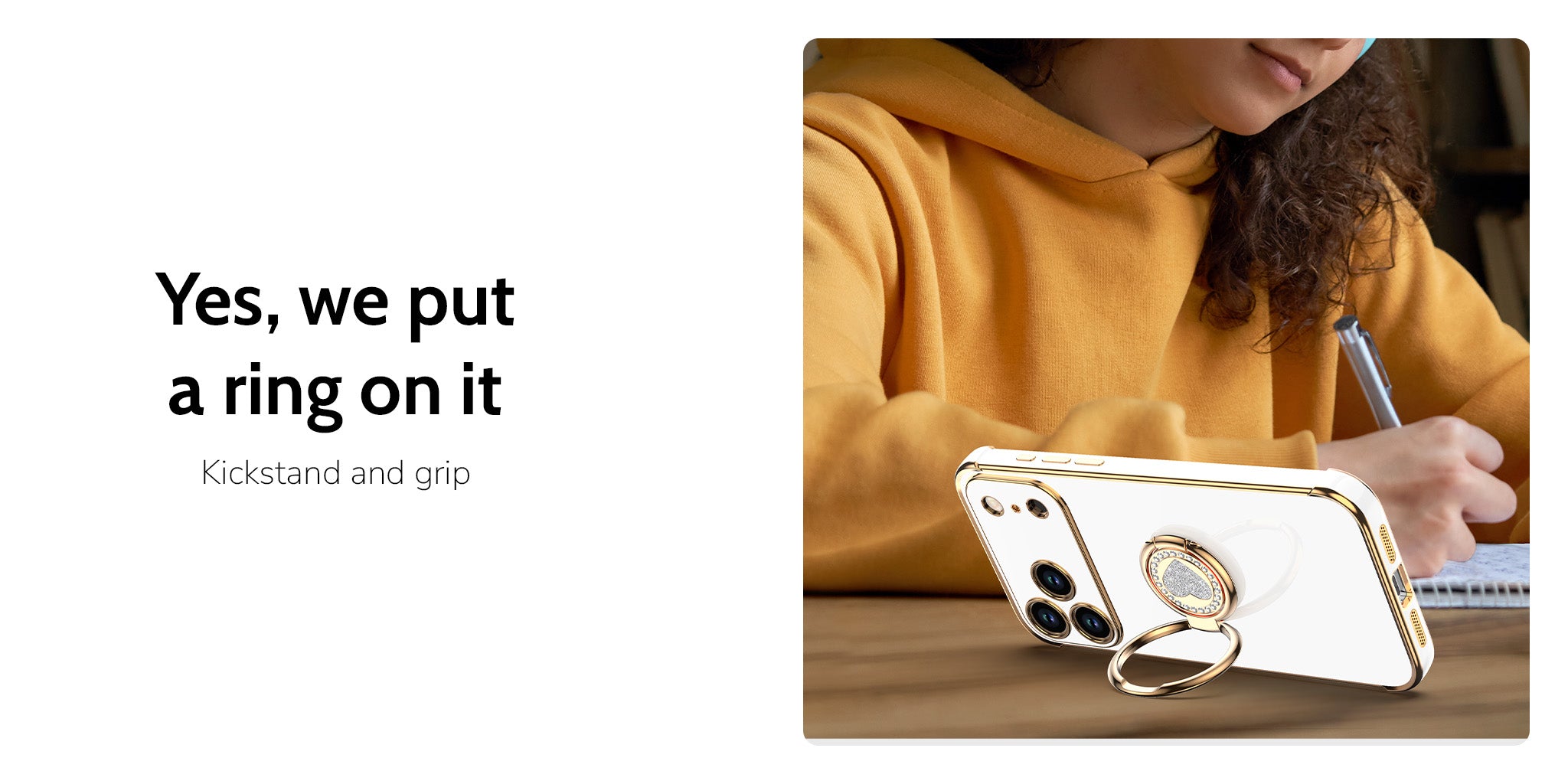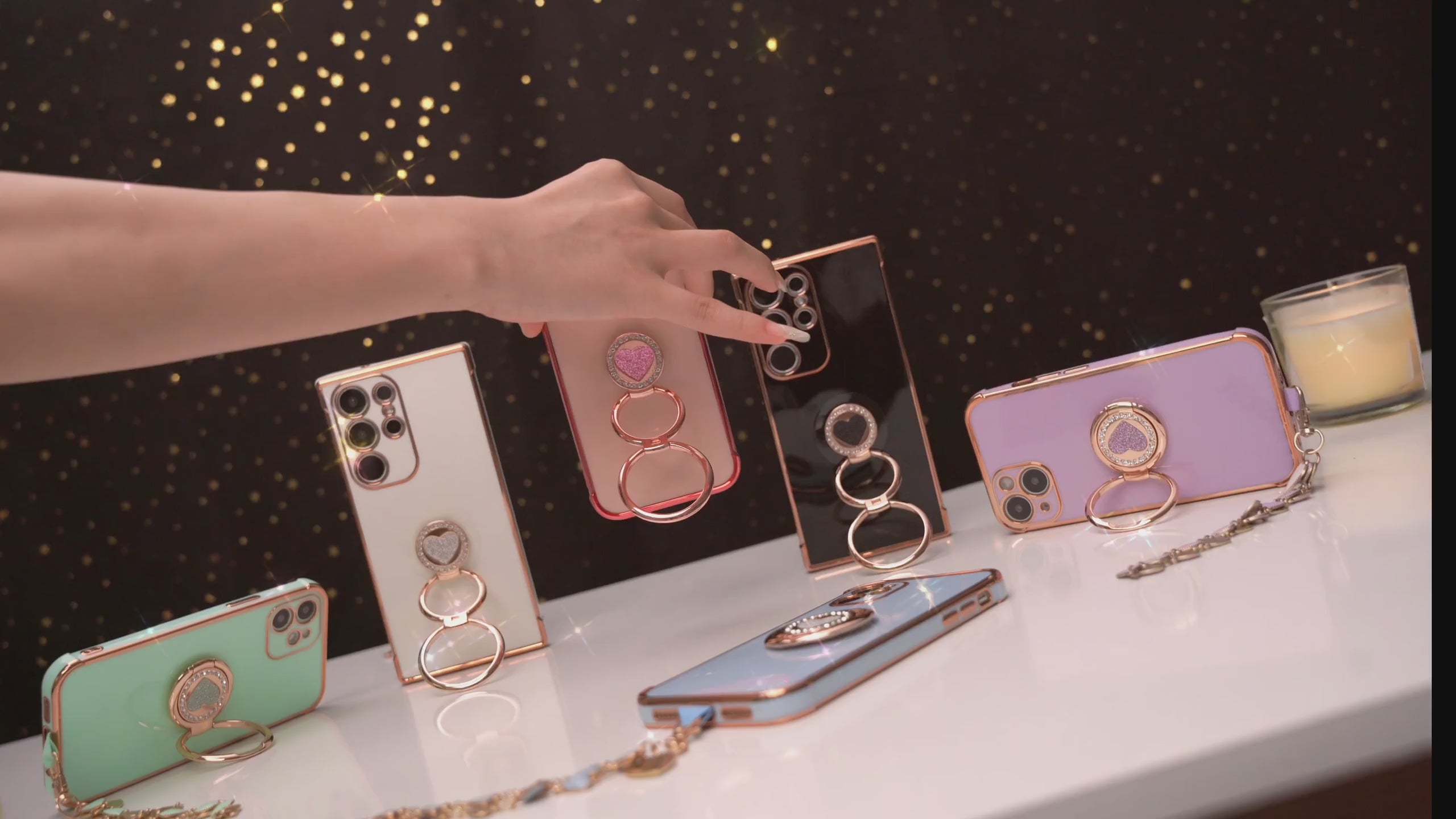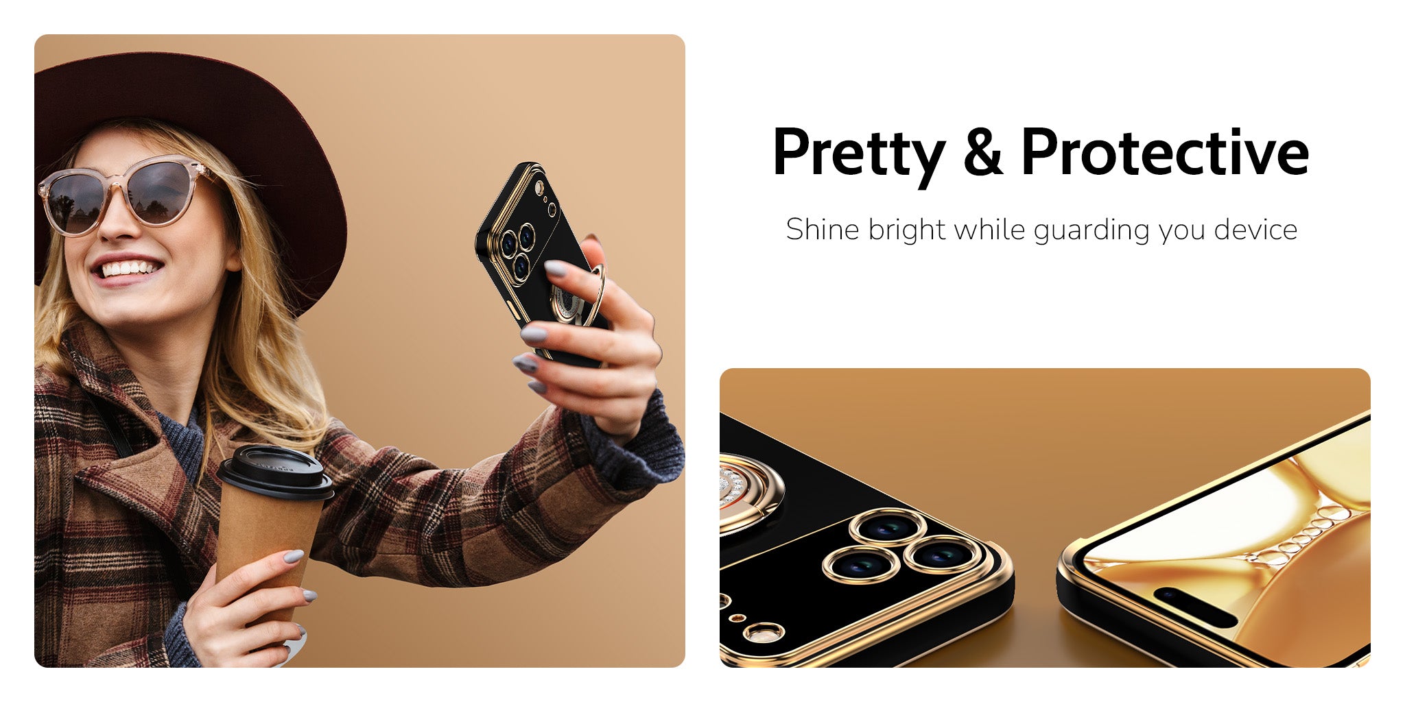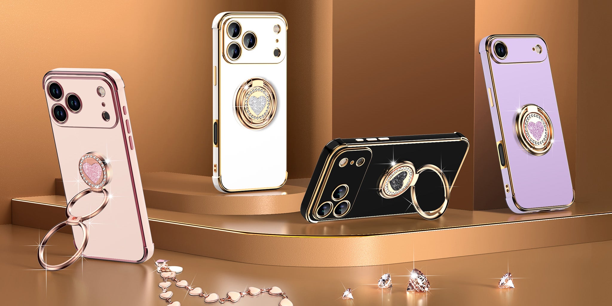 Say hi to the XYZ Classic Chrome Case, a cute blend of shine, sparkle, and everyday protection. With glossy gold edges, a heart-shaped double ring, and a matching heart wrist strap, this case turns your phone into a stylish little accessory. Whether you’re scrolling, video chatting, or snapping selfies, the rotating dual ring stand keeps everything hands-free and comfy. Cute style, secure grip, and daily protection all in one!