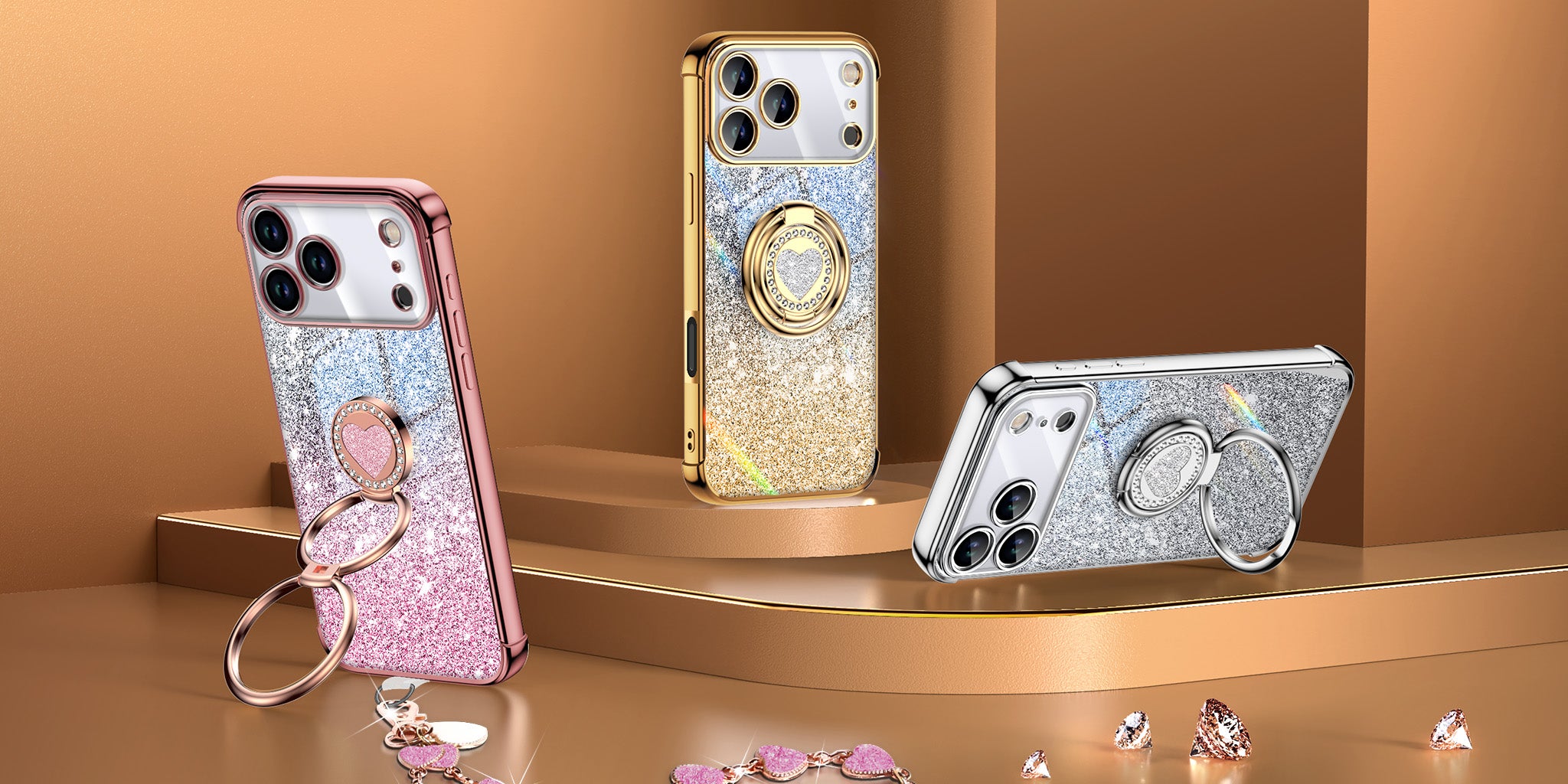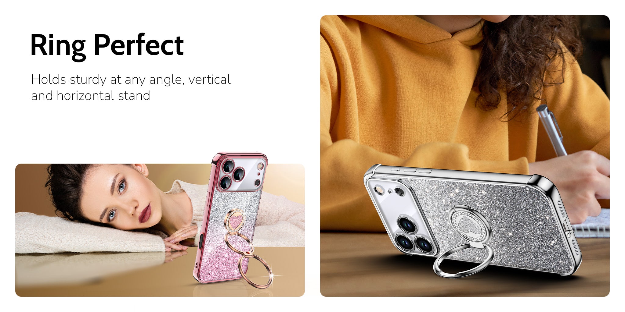 Say hi to the XYZ Super Shine Case, a cute blend of shine, sparkle, and everyday protection. With glossy gold edges, glittery sparkle center, a heart-shaped double ring, and a matching heart wrist strap, this case turns your phone into a stylish little accessory. Whether you’re scrolling, video chatting, or snapping selfies, the rotating dual ring stand keeps everything hands-free and comfy. Cute style, secure grip, and daily protection all in one!